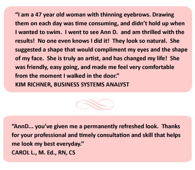 Ann D. offers popular cosmetic permanent makeup such as permanent eyebrows, eyeliner and lips. In addition, she provides medical tattooing which includes scar camouflage, stretch mark camouflage, areola restoration, hair simulation and cleft palate lip correction.